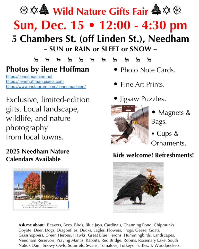 You can buy cards, fine art prints, magnets, puzzles, and more, plus order a 2026 Local Nature Calendar at the Needham Open Studios Fair and Show on November 1st. You can learn about safely taking photographs with any kind of camera at the Needham Camera Club meeting on November 9th! Everyone welcome at both events! Both events are in Needham, MA. If you cannot attend, you are welcome to peruse and purchase a variety of household items, including prints on Fine Art America. Please leave a comment below to let me know you’ve visited today!
