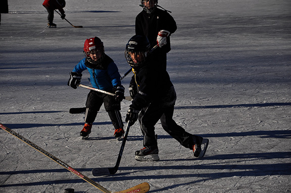 Kids playing hockey on Channing Pond, Dover MA. Under exposed image.